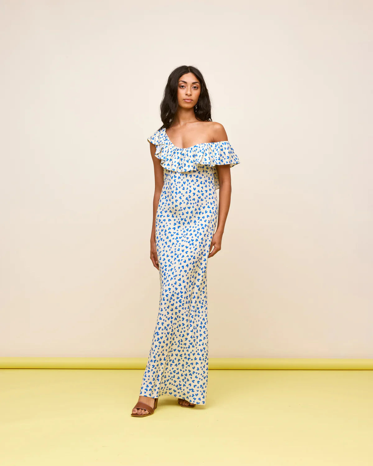 Bias cut midi dress with a feature ruffle neckline in a blue scatter heart print. Features a back tie and scooped back neck that adds to the soft look of this dress.