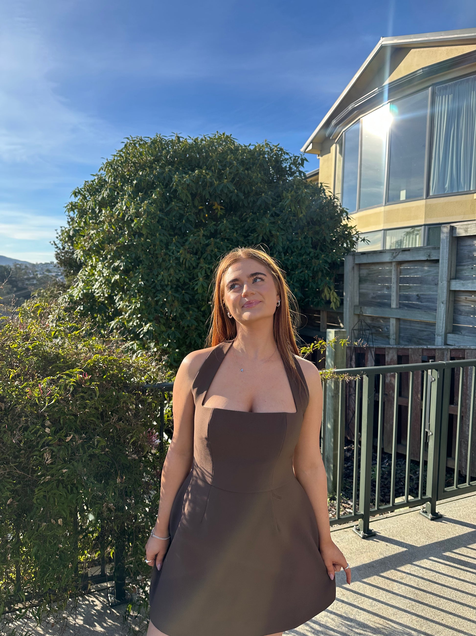 Designed in a rich chocolate hue, this dress continues the brand's signature halter neck style, now with a structured silhouette that's both elegant and sophisticated. Featuring a classic halterneck and a cinched waist, the dress is perfectly complemented by a lampshade skirt.